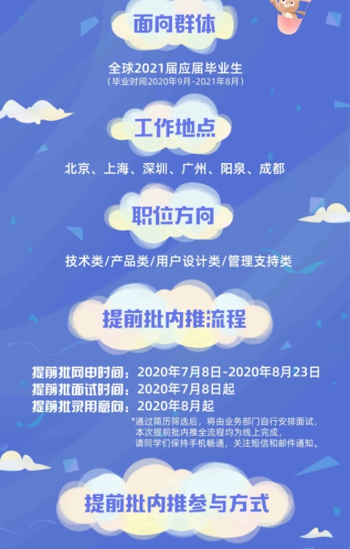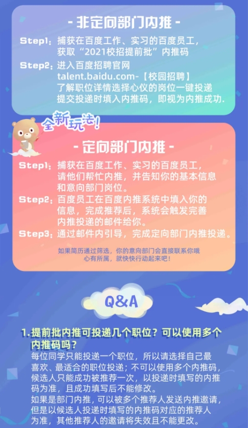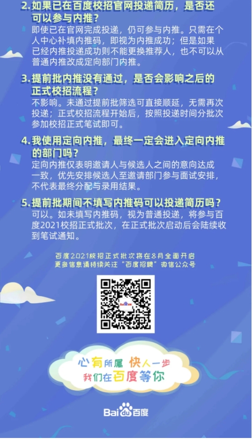 非定向部門內(nèi)推:捕獲在百度工作、實(shí)習(xí)的百度員工,獲取“2021校招提前批”內(nèi)推碼,投遞簡(jiǎn)歷時(shí)填寫內(nèi)推碼,即視為內(nèi)推成功
