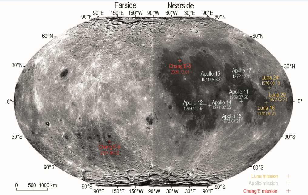 △嫦娥六號(hào)、嫦娥五號(hào)、美國(guó)Apollo計(jì)劃及蘇聯(lián)Luna計(jì)劃落點(diǎn)示意圖