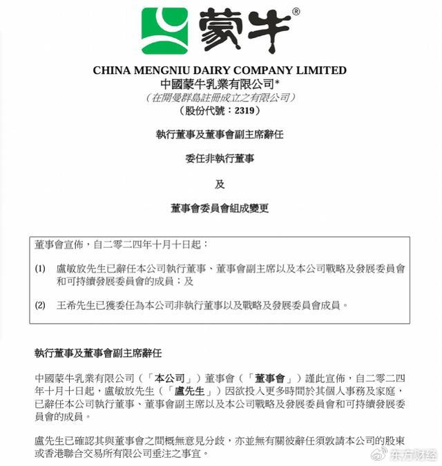 10月10日晚間,蒙牛乳業(yè)發(fā)布執(zhí)行董事及董事會(huì)副主席辭任、委任非執(zhí)行董事及董事會(huì)委員會(huì)組成變更公告。公告顯示,自2024年10月10日起,盧敏放已辭任公司執(zhí)行董事、董事會(huì)副主席以及公司戰(zhàn)略及發(fā)展委員會(huì)和可持續(xù)發(fā)展委員會(huì)的成員;王希已獲委任為公司非執(zhí)行董事以及戰(zhàn)略及發(fā)展委員會(huì)成員。