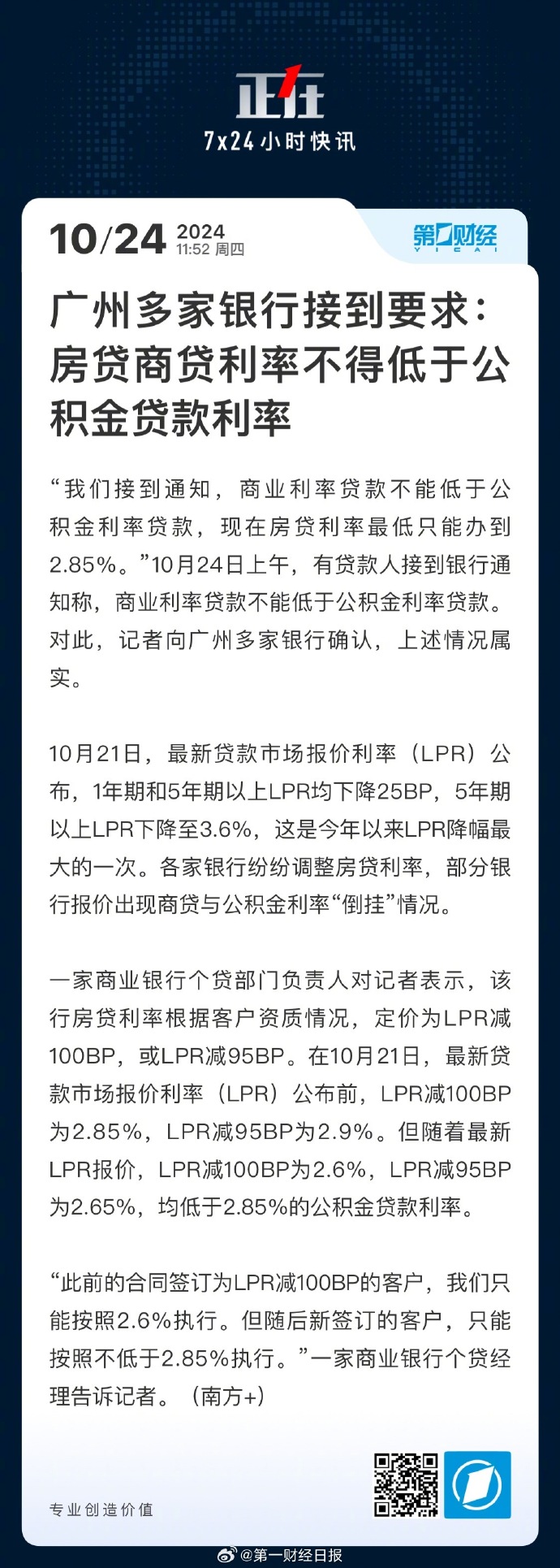 “我們接到通知,商業(yè)利率貸款不能低于公積金利率貸款,現(xiàn)在房貸利率最低只能辦到2.85%。”10月24日上午,有貸款人接到銀行通知稱,商業(yè)利率貸款不能低于公積金利率貸款。對(duì)此,記者向廣州多家銀行確認(rèn),上述情況屬實(shí)。