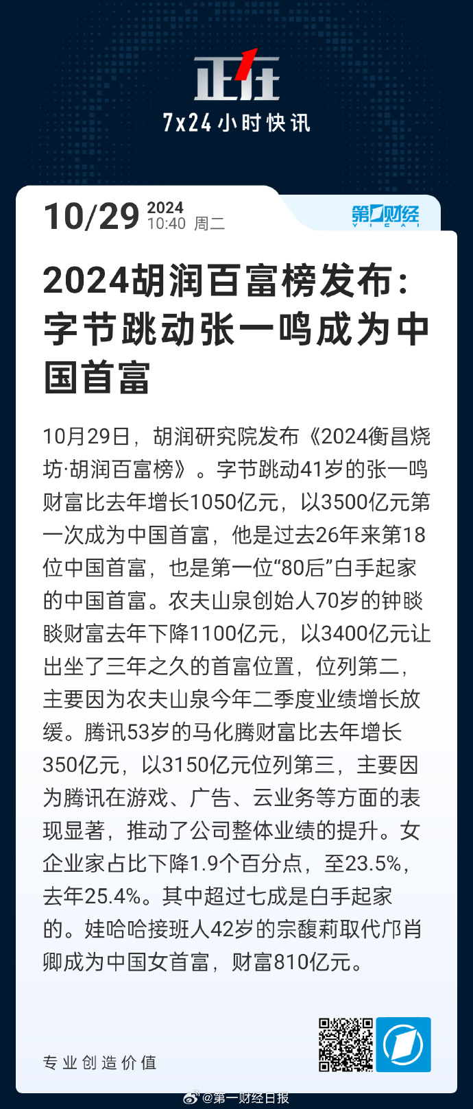 10月29日,胡潤(rùn)研究院發(fā)布《2024衡昌燒坊·胡潤(rùn)百富榜》。字節(jié)跳動(dòng)41歲的張一鳴財(cái)富比去年增長(zhǎng)1050億元,以3500億元第一次成為中國(guó)首富,他是過去26年來第18位中國(guó)首富,也是第一位“80后”白手起家的中國(guó)首富。農(nóng)夫山泉?jiǎng)?chuàng)始人70歲的鐘睒睒財(cái)富去年下降1100億元,以3400億元讓出坐了三年之久的首富位置,位列第二,主要因?yàn)檗r(nóng)夫山泉今年二季度業(yè)績(jī)?cè)鲩L(zhǎng)放緩。騰訊53歲的馬化騰財(cái)富比去年增長(zhǎng)350億元,以3150億元位列第三,主要因?yàn)轵v訊在游戲、廣告、云業(yè)務(wù)等方面的表現(xiàn)顯著,推動(dòng)了公司整體業(yè)績(jī)的提升。女企業(yè)家占比下降1.9個(gè)百分點(diǎn),至23.5%,去年25.4%。其中超過七成是白手起家的。娃哈哈接班人42歲的宗馥莉取代鄺肖卿成為中國(guó)女首富,財(cái)富810億元。