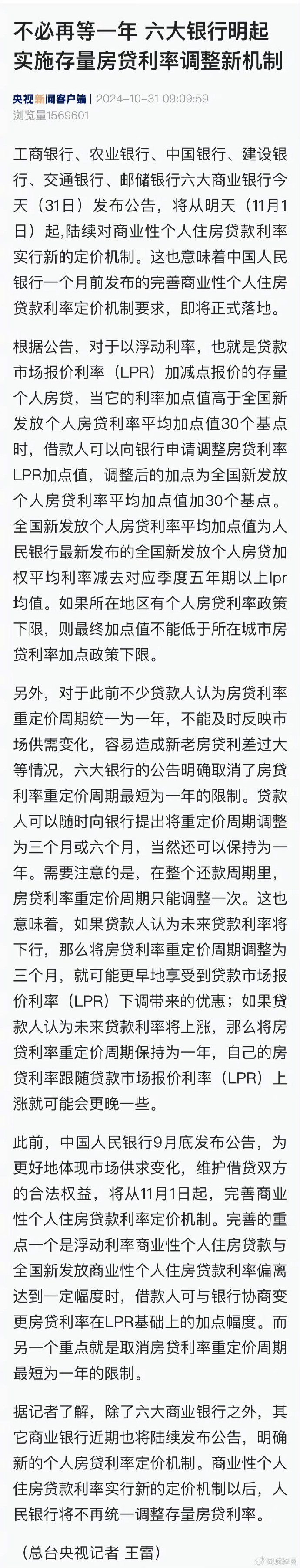 據(jù)記者了解,除了六大商業(yè)銀行之外,其它商業(yè)銀行近期也將陸續(xù)發(fā)布公告,明確新的個人房貸利率定價機(jī)制。商業(yè)性個人住房貸款利率實行新的定價機(jī)制以后,人民銀行將不再統(tǒng)一調(diào)整存量房貸利率。