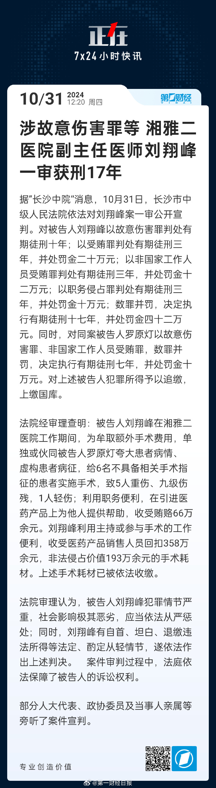 涉故意傷害罪等 湘雅二醫(yī)院副主任醫(yī)師劉翔峰一審獲刑17年