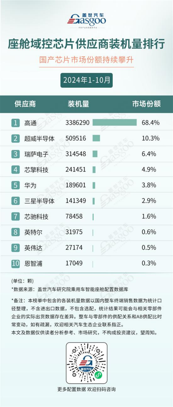 座艙域控芯片供應(yīng)商裝機(jī)量排行 來源:蓋世汽車研究院
