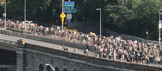 紐約當(dāng)天也有數(shù)千名示威者從布魯克林大軍廣場開始游行,穿過市區(qū)、布魯克林大橋,最終來到位于曼哈頓的紐約市政廳。他們高舉著包括“沒有正義,就沒有和平”、“停止資助警察”等各式各樣的標(biāo)語。