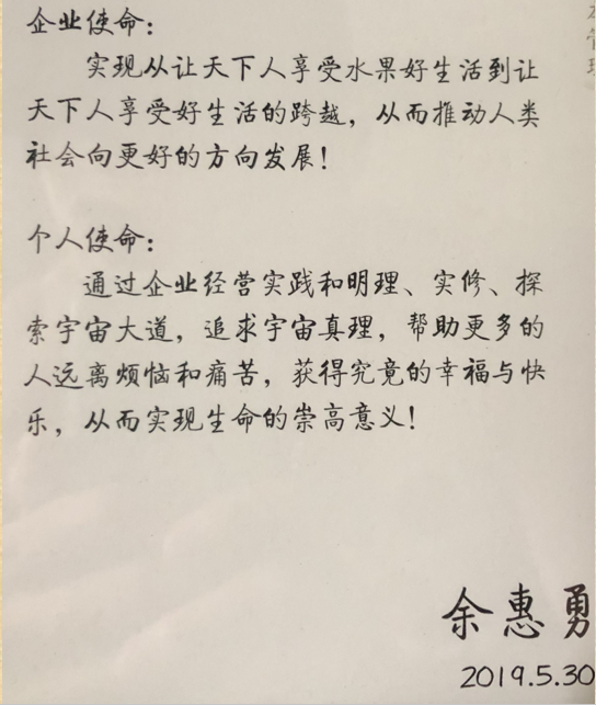 百果園余惠勇董事長以企業(yè)經(jīng)營發(fā)展的底層邏輯《九死一生悟商道》為題,為我們產(chǎn)業(yè)領(lǐng)袖一期班企業(yè)家學員上了一堂生動而富有哲理的企業(yè)經(jīng)營思想與案例課。百果園是華夏基石的長期合作伙伴,我們彼此之間在企業(yè)經(jīng)營的底層邏輯與價值觀上是有高度共識的。正如余董一開場就講到的:企業(yè)家做企業(yè),最重要的是悟“道”。這個道,就是規(guī)律,就是企業(yè)的初心,就是企業(yè)的價值觀,就是企業(yè)經(jīng)營的底層邏輯與經(jīng)營大法。百果園:基于信任的商業(yè)模式和企業(yè)文化大家可能認為企業(yè)經(jīng)營的底層邏輯是很虛的東西,但通過余董今天的案例分享,我們可以看到企業(yè)經(jīng)營的底層邏輯是一個很實的東西。它就是企業(yè)的經(jīng)營大法。這個經(jīng)營大法使得企業(yè)家與企業(yè)有自己清晰的戰(zhàn)略思維,有自己堅守的價值立場,有自己獨創(chuàng)的經(jīng)營發(fā)展之道。尤其是今天再次與余董交流,再次聽余董對百果園成長過程中自身心理歷程與經(jīng)營感悟的分享,使我們更深刻地認識到企業(yè)經(jīng)營就是大道至簡,就像余董所談到的,回歸到企業(yè)經(jīng)營的核心。如果要概括百果園的成功之道,我認為,首先就是贏在一個“信”字——基于信任的商業(yè)模式和企業(yè)文化,基于信任的公司治理與人才管理機制,基于信任的相關(guān)利益者價值平衡與產(chǎn)業(yè)生態(tài)構(gòu)建。百果園“信任”經(jīng)營之道的成功,也讓我們增強了民族自信與文化自信,即中國人是值得信任的,信任是可以創(chuàng)造價值的,中國傳統(tǒng)優(yōu)秀文化是有信任“紅利”的。