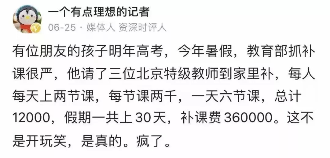 十年前C9的學(xué)生兼職給高二孩子補(bǔ)課一小時(shí)50元,現(xiàn)在這個(gè)價(jià)格只能上初中的網(wǎng)課。高中數(shù)學(xué)線下一對(duì)一輔導(dǎo)400元一小時(shí)不是開玩笑。