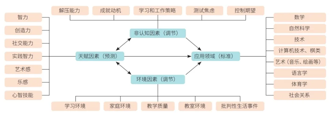 Heller?等基于慕尼黑天才模型的研究側(cè)重在非認(rèn)知因素和環(huán)境因素的調(diào)節(jié)作用,天賦因素的預(yù)測(cè)價(jià)值,以及應(yīng)用領(lǐng)域的適宜標(biāo)準(zhǔn)。非認(rèn)知因素側(cè)重于解壓能力、成就動(dòng)機(jī)、學(xué)習(xí)和工作策略、測(cè)試焦慮和控制期望;環(huán)境因素涉及學(xué)習(xí)環(huán)境、家庭環(huán)境、教學(xué)質(zhì)量、教室環(huán)境、批判性生活事件;天賦因素則包括智力、創(chuàng)造力、社交能力、實(shí)踐智力、藝術(shù)感、樂(lè)感、心智技能;而應(yīng)用領(lǐng)域表現(xiàn)為數(shù)學(xué)、自然科學(xué)、技術(shù)、計(jì)算機(jī)技術(shù)、棋類、藝術(shù)(音樂(lè)、繪畫(huà)等)、語(yǔ)言學(xué)、體育學(xué)和社會(huì)關(guān)系(圖?2)。