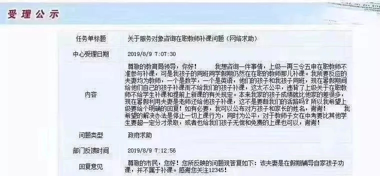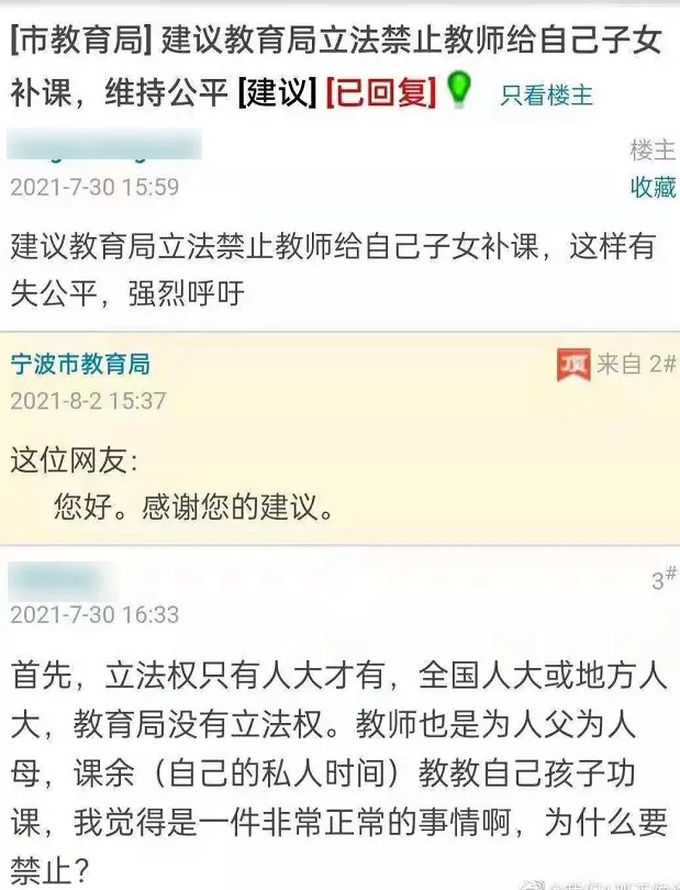 寧波市民生e點(diǎn)通欄目,收到群眾建議,“建議教育局立法禁止教師給自己的子女補(bǔ)課,這樣有失公平!”網(wǎng)友都看不下去了,仗義駁斥:“教育局沒有立法權(quán),教師也是為人父母,教自己的孩子怎么就要被禁止了?”說起“教師給自己的孩子補(bǔ)課”被針對(duì),這可不是首例。2019年,就有位家長,為這事兒,把自己孩子的老師給舉報(bào)了