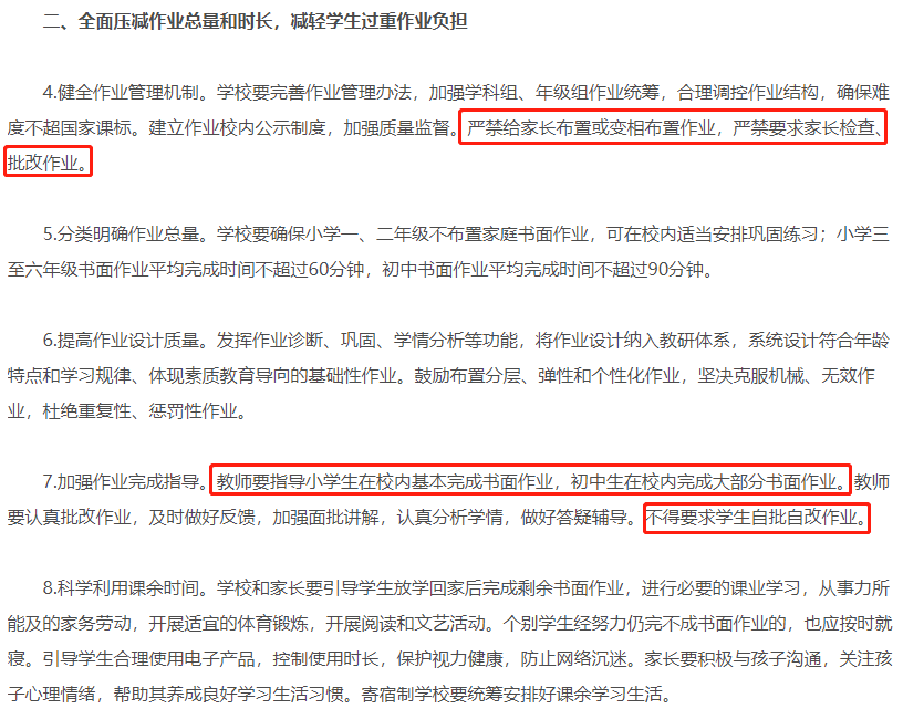 ① 嚴禁給家長布置或變相布置作業(yè),嚴禁要求家長檢查、批改作業(yè)。