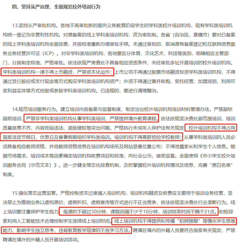 ① 學科類培訓機構一律不得上市融資,嚴禁資本化運作;