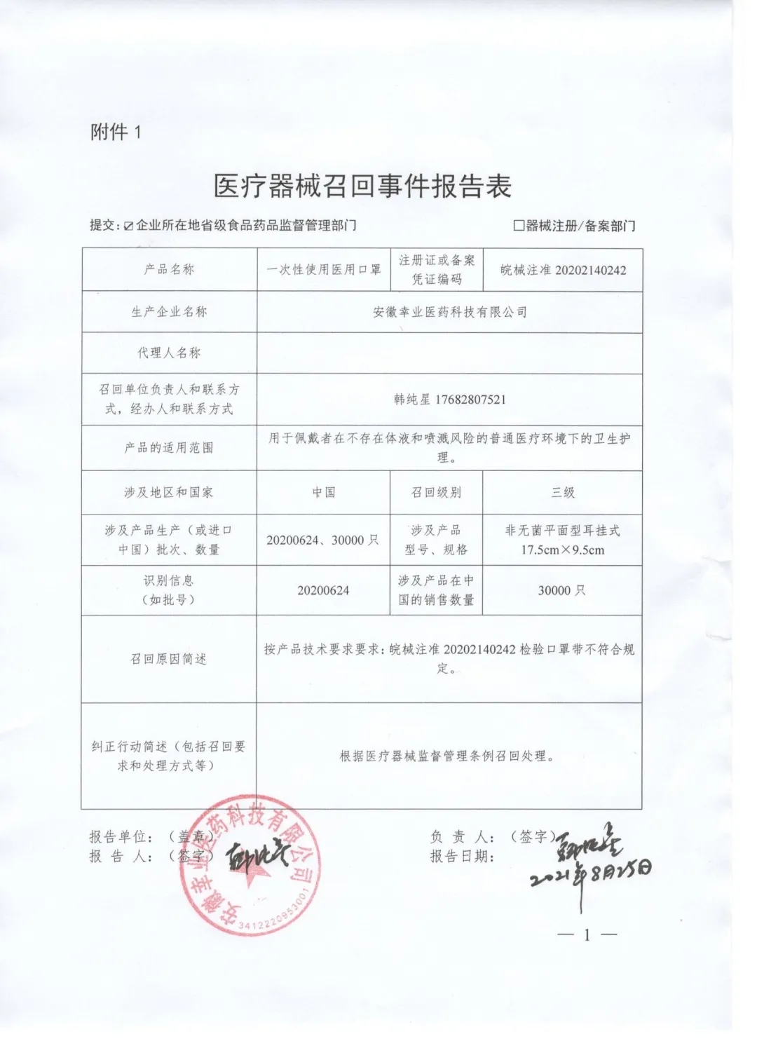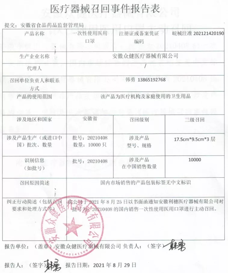 據安徽省藥品監(jiān)督管理局8月30日消息:近日,安徽幸業(yè)醫(yī)藥科技有限公司、安徽眾健醫(yī)療器械有限公司對一次性使用醫(yī)用口罩主動召回。安徽幸業(yè)醫(yī)藥科技有限公司報告:批號為20200624的一次性使用醫(yī)用口罩經抽檢不合格。安徽幸業(yè)醫(yī)藥科技有限公司對其生產的批號20200624的一次性使用醫(yī)用口罩主動召回。召回級別為三級。涉及產品的型號、規(guī)格及批次等詳細信息見《醫(yī)療器械召回事件報告表》:安徽眾健醫(yī)療器械有限公司報告:批號為20210408的一次性使用醫(yī)用口罩,國內市場銷售的產品包裝標簽無中文標識,安徽眾健醫(yī)療器械有限公司決定對批號為20210408國內市場銷售的產品產品主動召回。召回級別為三級。涉及產品的型號、規(guī)格及批次等詳細信息見《醫(yī)療器械召回事件報告表》: