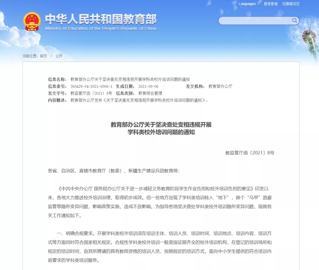 據(jù)教育部網(wǎng)站消息,教育部發(fā)布《教育部辦公廳關(guān)于堅(jiān)決查處變相違規(guī)開展學(xué)科類校外培訓(xùn)問(wèn)題的通知》,堅(jiān)決查處變相違規(guī)開展學(xué)科類校外培訓(xùn)。全文如下: