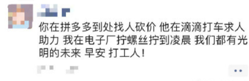 “你在拼多多到處找人砍價(jià),他在滴滴打車求人助力,我在電子廠擰螺絲擰到凌晨,我們都有光明的未來(lái)!早安,打工人!”