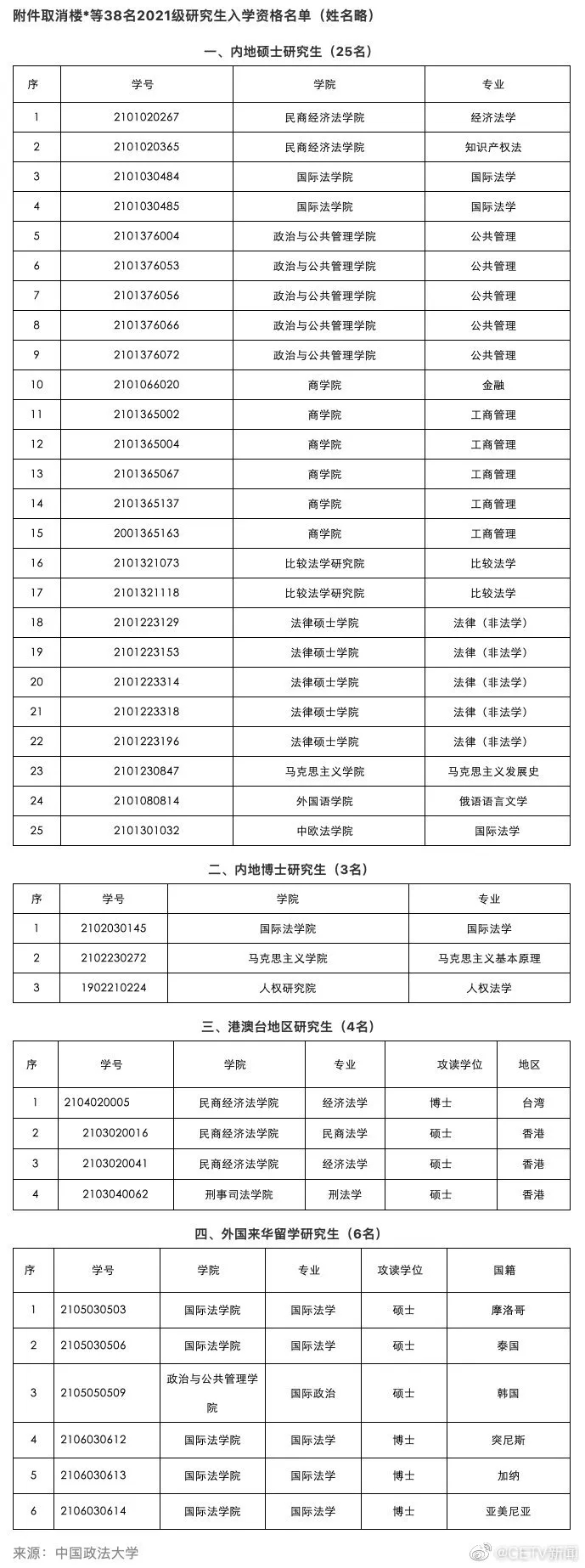 中國(guó)政法大學(xué)擬取消38名研究生入學(xué)資格