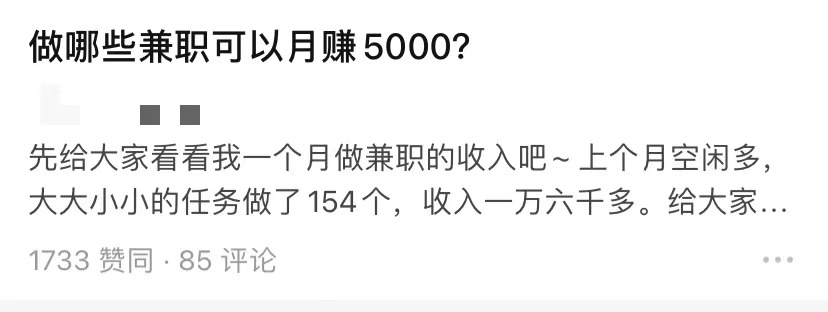在互聯(lián)網上,副業(yè)剛需時代可能已經邁入2.0了,因為知乎上連兼職的提問,都是3000元起跳,而答案往往是以媲美全職的工資、幾乎不用干活的輕松作為引入,拉到最后,則是培訓班招生廣告或者刷單邀請函。