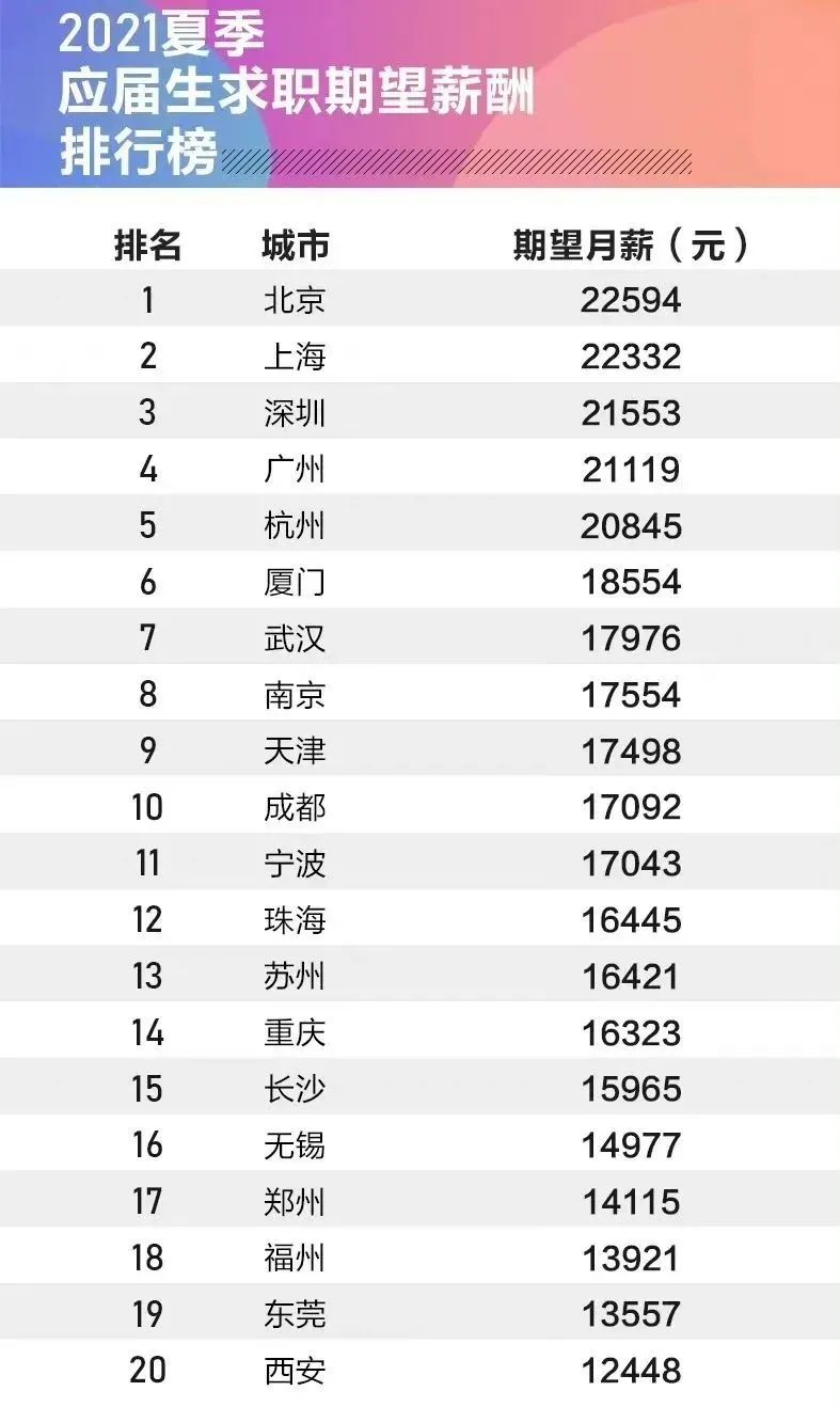 在排行榜中,北上廣深杭的期望月薪都超過2萬元,其中北京以22594元位列第一,就連排到第20名的西安,也是過萬的期望值。