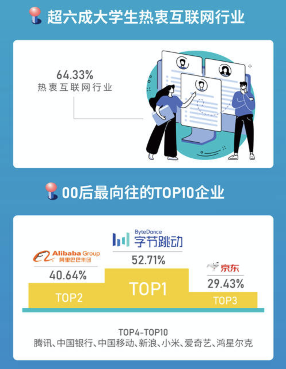 而針對大學生對企業(yè)的好感度的調查結果顯示,受訪00后大學生最向往的企業(yè)前三名分別是字節(jié)跳動、阿里巴巴和京東。