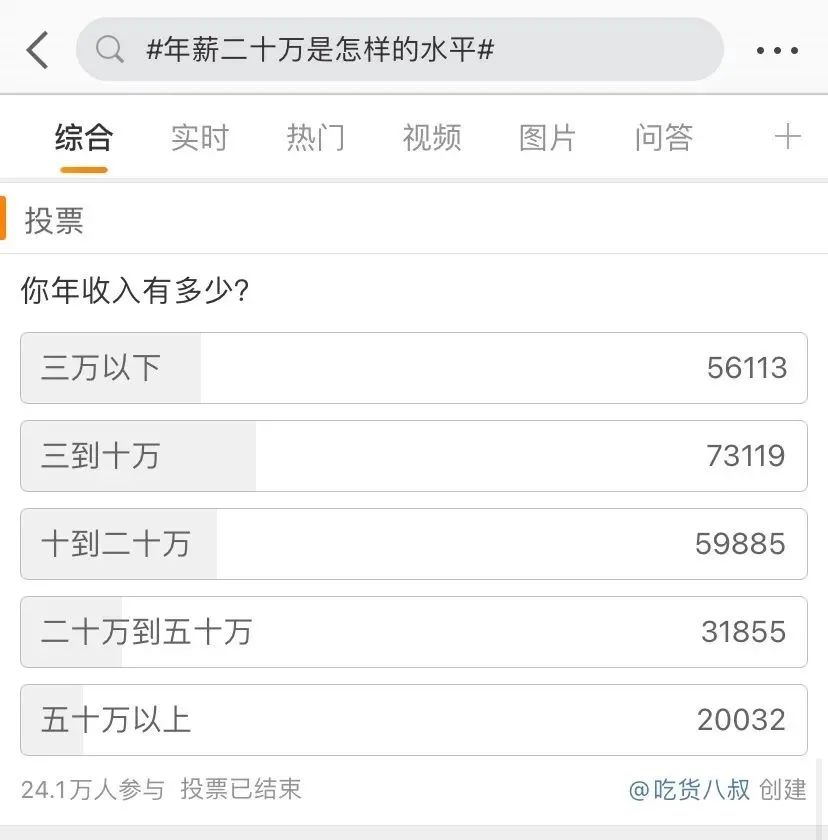 前段時間有網友在微博發(fā)起了關于年收入的投票。參與投票的24.1萬人中,年收入區(qū)間在三萬到十萬元的占比最多。