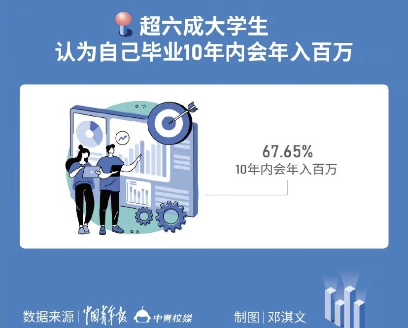 不過認真想一想,在知乎人均“人在美國剛下飛機”、微博人均清北復交、小紅書總在喜提豪車的網絡世界里,00后大學生覺得自己10年內年入百萬,難道不是很合理嗎?