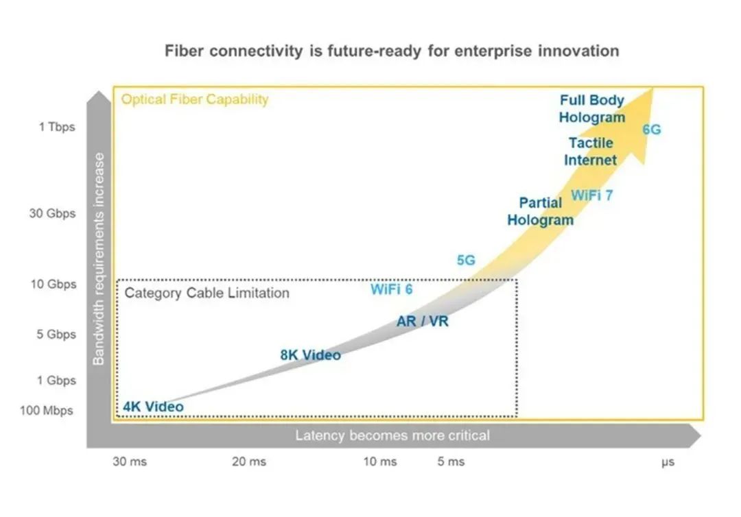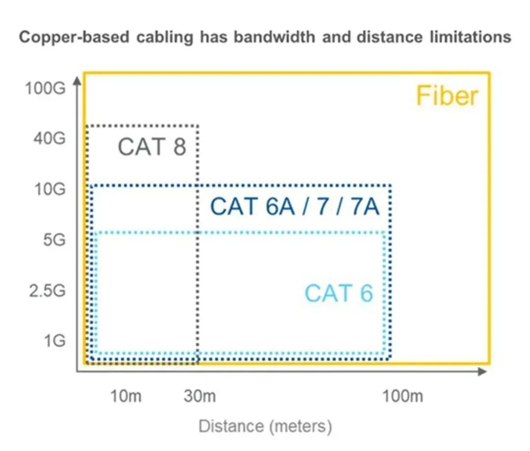 為了實現(xiàn)這些Wi-Fi 7的速度,CAT8可達到40Gbps的速度,但只能跨越30米(約100英尺)的距離。對于一個企業(yè)建筑來說,如果要繼續(xù)使用銅纜的升級路徑,那么他們需要放棄可創(chuàng)造收入的空間來建立更多的電信室,還要增加昂貴的交換設備機架,使用電源和冷卻技術維護這些空間,并確?,F(xiàn)有的路徑足夠大,才能適應CAT8的升級。