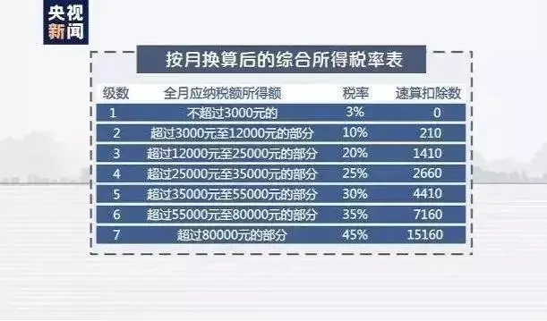 其中,速算扣除數(shù)和稅率對(duì)應(yīng)全月應(yīng)納稅所得額,分為7個(gè)檔次。