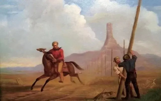 一位騎馬的郵遞員,飛快地經(jīng)過一個正在緩慢架設(shè)的電報桿。