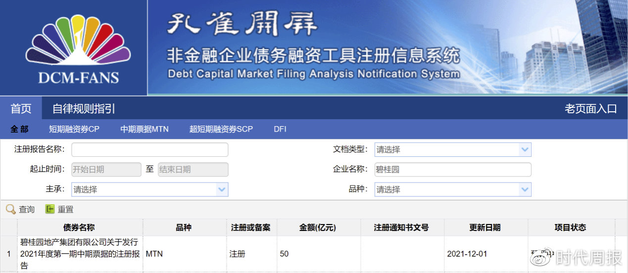 12月1日,中國銀行間市場交易商協(xié)會非金融企業(yè)債務(wù)融資工具注冊信息系統(tǒng)顯示,碧桂園境內(nèi)主體“碧桂園地產(chǎn)集團(tuán)有限公司”計(jì)劃在銀行間債券市場注冊發(fā)行50億元中期票據(jù),相關(guān)注冊申請已獲受理,進(jìn)入預(yù)評環(huán)節(jié)。這是碧桂園地產(chǎn)集團(tuán)有限公司首次在銀行間市場交易商協(xié)會申報(bào)注冊“中期票據(jù)”。