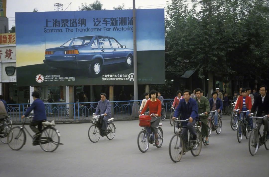 1986年,四川成都,騎自行車的人們經(jīng)過大幅的桑塔納汽車廣告牌。/視覺中國