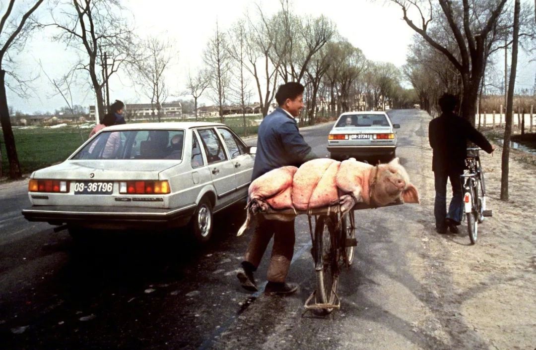 1985年,在上海市郊的兩輛桑塔納轎車與騎自行車的路人。/視覺中國