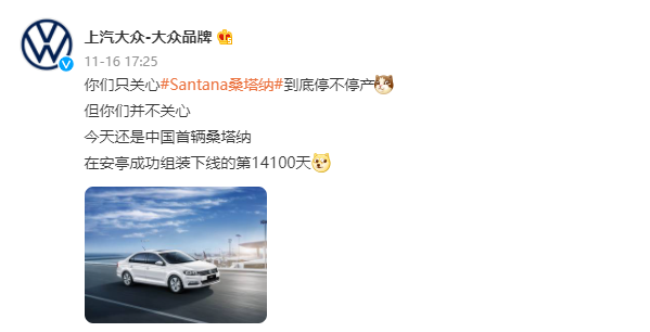 “今天(11月16日),是中國首輛桑塔納在安亭成功組裝下線的第14100天。”