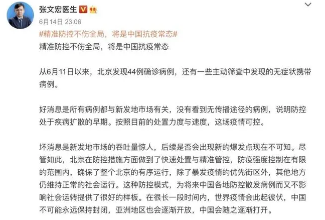 6月12日,北京豐臺通報(bào)兩例新增確診病例后,張文宏曾發(fā)文表示,很長一段時(shí)間,中國會(huì)持續(xù)處于“接近零(本土)病例”的狀態(tài),而并非“無病例”,對此我們要有清醒的認(rèn)識,不要因此采取過度防疫,終止經(jīng)濟(jì)和民生的復(fù)蘇。