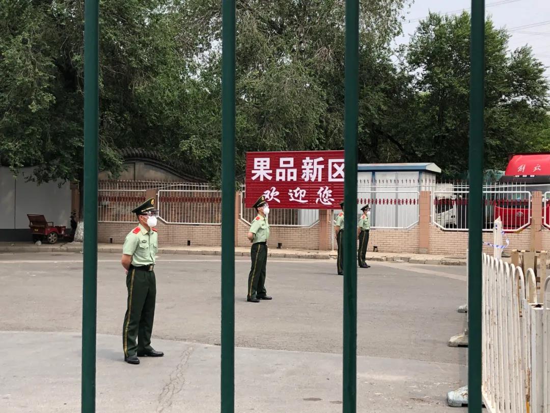 6月13日下午,北京新發(fā)地農(nóng)產(chǎn)品批發(fā)市場(chǎng)果蔬市場(chǎng)已經(jīng)封閉,在市場(chǎng)內(nèi)站崗的武警帶著口罩和防護(hù)鏡。攝影/本刊記者 張旭