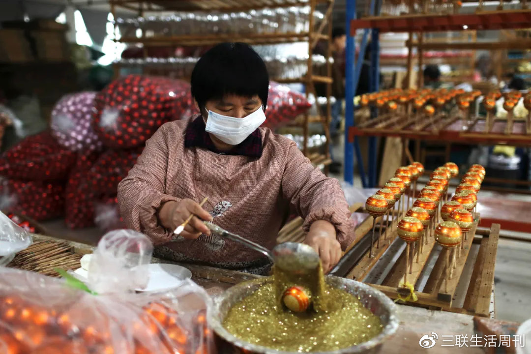 這些半成品送到四樓,工人手工完成彩繪、包裝流程。彩繪車間有十多名員工,都在40歲以上,他們穿著罩衣戴著口罩,用棒簽插著圣誕球,快速描繪出圖案、撒上金粉,排列好晾在木架上,像一顆顆巨型棒棒糖。在旺季,“員工至少是現(xiàn)在的兩倍”。任子玉對本刊記者說。