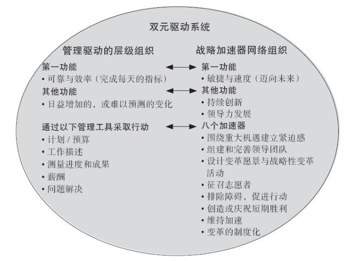 我所見到的令人欣喜的解決方案,就是網(wǎng)絡(luò)狀的第二系統(tǒng)——比起一個(gè)成熟的金字塔組織,它更像是一個(gè)剛剛啟動(dòng)的太陽(yáng)系,具有靈敏性和快速運(yùn)行的特點(diǎn)。它是成熟組織的一種強(qiáng)有力的互補(bǔ),而不是為組織增加負(fù)擔(dān),目的是最大化地釋放組織的潛能。它使得組織的運(yùn)行更加高效,同時(shí)加速戰(zhàn)略變革。這不是一個(gè)二選一的問(wèn)題,而是兩者融合:兩個(gè)系統(tǒng)協(xié)同運(yùn)行,也就是一個(gè)雙元驅(qū)動(dòng)運(yùn)行體系。