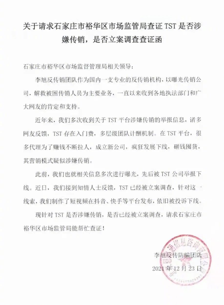 反傳銷人士李旭及其團隊至少從兩年前開始就接到有關林瑞陽、張庭夫婦旗下公司是否涉嫌傳銷的詢問,但因長期沒有詳細資料,未能深入了解。2021年4月,一位加入團隊超5年的用戶小花(化名)向李旭團隊咨詢后向相關部門舉報。12月23日,李旭向石家莊裕華區(qū)市場監(jiān)督管理局寫信查證,并獲回復。隨后,經(jīng)過媒體報道,這一事件登上熱搜。