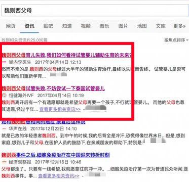 據(jù)北京青年報報道,2019年1月,記者以“魏則西父母“為關(guān)鍵字在某搜索引擎上搜索,卻發(fā)現(xiàn)了試管嬰兒廣告。