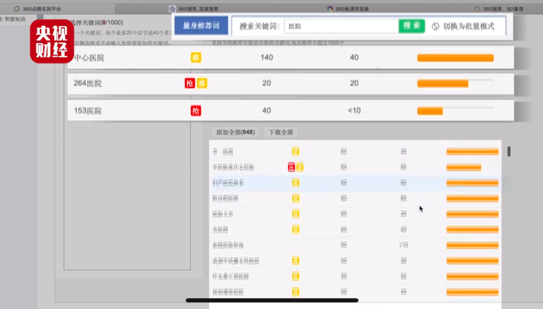 盡管目前公立醫(yī)院的全稱已經(jīng)建立了相應(yīng)的保護(hù)機(jī)制。但是,這些醫(yī)院的簡稱仍然可以作為關(guān)鍵詞用于其他醫(yī)院的廣告。“這些著名醫(yī)院通常不能提及全名,只能提及簡稱“。360廣告代理銷售經(jīng)理告訴央視記者。此外,在公立醫(yī)院的全名之間加間隔,也可以作為關(guān)鍵詞在其他醫(yī)院進(jìn)行廣告推廣。