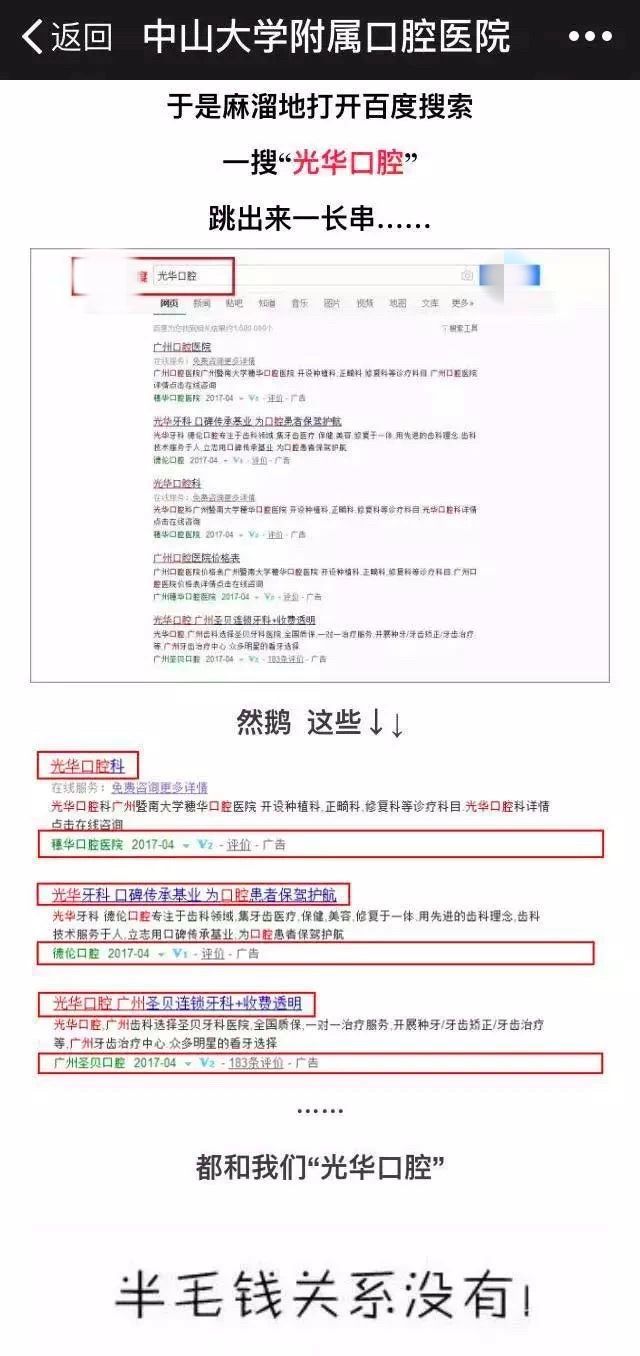 2017年3月,中山大學(xué)某醫(yī)院公眾號曝光該搜索引擎,擅用自己醫(yī)院的品牌為莆田醫(yī)院做宣傳。