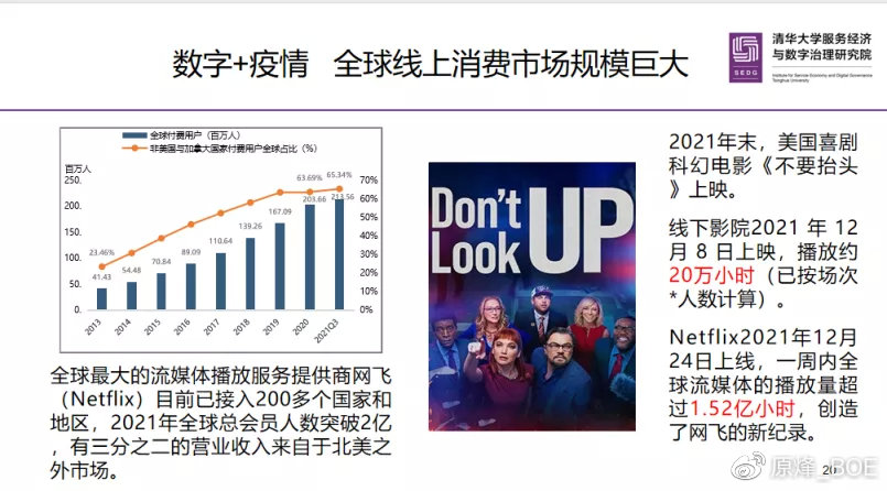 我舉一個最新的例子。2021年末,全球上映了一部美國新的喜劇片《不要抬頭》。線下影院12月8號上映以后觀眾的觀看時長是20萬小時,也就是有八萬多人進影院觀看了這部電影。而這部影片在全球最大的影視產品流媒體平臺美國Netflix上線后,12月24號上線到新年的一周時間內,全球播放量超過了1.52億小時,刷新了線上影片播放紀錄。網飛(Netflix)是全球最大的流媒體播放服務提供商,目前已接入200多個國家和地區(qū),2021年全球總會員人數(shù)突破2億,有三分之二的營業(yè)收入來自于北美之外市場。這類數(shù)字平臺實現(xiàn)全球消費者的連接,邊際成本很低。線上線下消費的巨大差距,有疫情的影響,但從根本上講是數(shù)字技術快速發(fā)展帶來的變化。這種數(shù)字化消費習慣在疫情之后會持續(xù),線上線下的消費一定和從前是極大不一樣的。