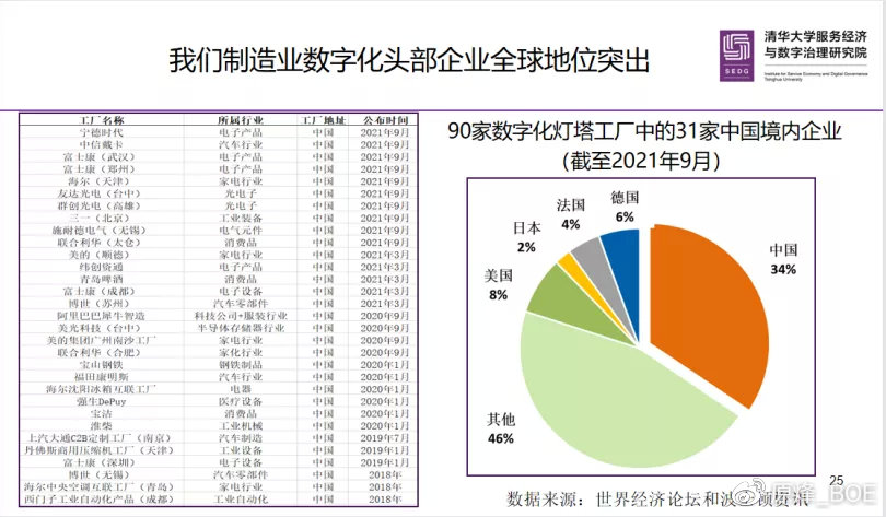 三是頭部企業(yè)的成長。這是世界經濟論壇和麥肯錫資訊兩家一直做的數(shù)字時代的全球燈塔工廠,依據(jù)是工廠的智能生產程度。這是最新的名單,一共90家,90家全球數(shù)字4.0時代的頭部企業(yè)中,有31家在中國,就是橙色的比例部分,說明我們的企業(yè)在全球上也是很有競爭力的。