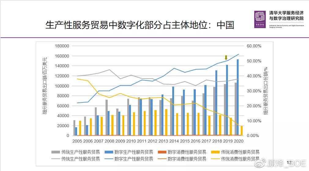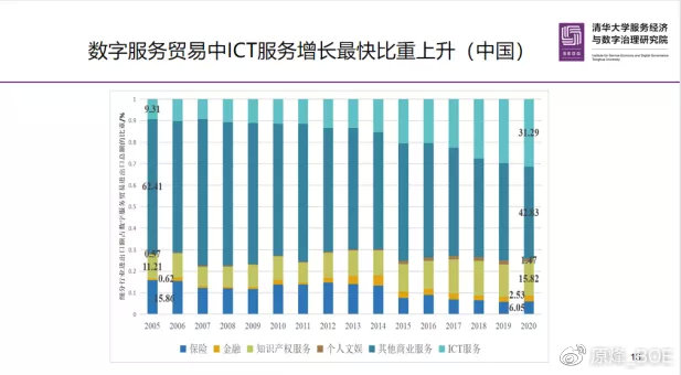 二是行業(yè)層面,數(shù)字化的服務貿易中間增長最快的是最上面的部分,就是ICT服務,從2005年占9.31%已經漲到了目前的三分之一。這個比重變化說明和數(shù)字技術最緊密相關的ICT服務貿易份額的增長是最快的。