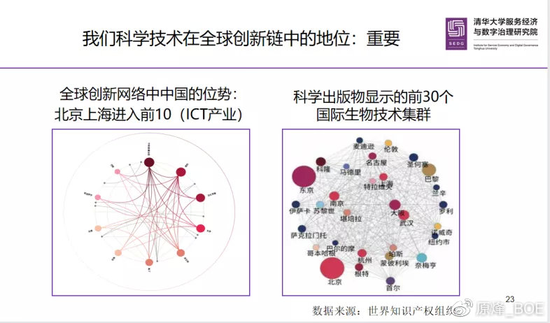 一是在科學研究和技術開發(fā)中,我們都有較強的合作能力。下面圖11是我們在全球合作研究和共同開發(fā)網絡中間的地位。左邊圖是ICT產業(yè)的全球技術創(chuàng)新網絡,有十個最大的共創(chuàng)節(jié)點,六點位置是上海,八點位置是北京。右邊圖是生物技術領域的科學出版合作發(fā)表網絡,圈子大小表示貢獻大小,可以看到,東京和北京已經在多國共同發(fā)表的原創(chuàng)性科學論文的排名中排在前兩位,貢獻很大,很有實力了。