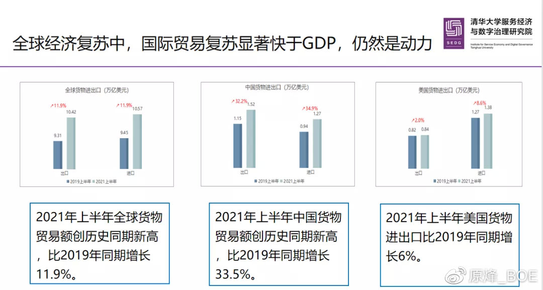 雖然有不少觀點認為最近國際環(huán)境不好,國際貿易會受到影響,但是疫情之后全球化在繼續(xù)發(fā)展,一個指標就是貿易增長顯著快于經濟增長。下面圖4是2021年上半年和2019年上半年相比,全球、中國和美國的貨物進出口額,都明顯快于各自國內經濟的恢復。
