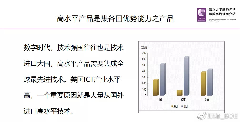 這里先舉一個產業(yè)的例子,ICT產業(yè)。圖里最左邊的是中國,藍色的是出口,黃色是進口。中國和印度都是ICT的出口比進口強,我們可能會覺得挺不錯,我們的技術在出口。但是圖里最右邊的美國,進口和出口幾乎相當,但我們不會想到美國在這個產業(yè)中的競爭力不如中國和印度。這表明在類似ICT這樣的高技術產業(yè),技術復雜并且快速迭代,哪一個國家想生產出全球最新、最高技術水平的產品,就不太可能完全只靠自己,生產一個最有競爭力的產品需要集成全球最好的技術,因此會有大量的進口,然后與國內的部分結合,才能做成全球最厲害的產業(yè)。