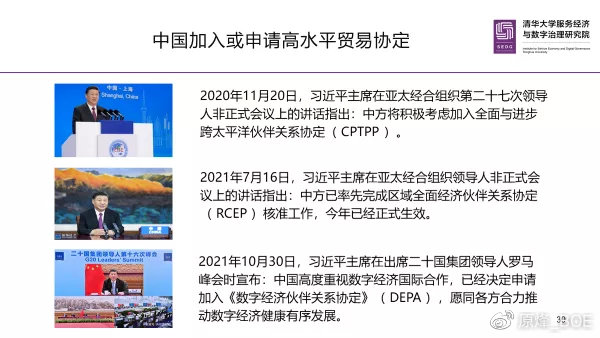 五是我們積極加入高水平貿易協(xié)定。2018年以來,國際上簽署了一些高標準自由貿易協(xié)定,如日歐EPA、美墨加協(xié)定、歐加FTA、CPTPP等。這些貿易協(xié)定涉及零關稅、服務業(yè)開放、服務貿易、電子商務及市場準入、知識產權保護、環(huán)境保護、數(shù)據(jù)流動規(guī)則等,這些協(xié)定全部生效后,將覆蓋55%以上的國際貿易和國際投資,推動相關領域新一輪全球化進程。我們對加入高水平貿易協(xié)定和數(shù)字相關貿易協(xié)定持積極態(tài)度,表明我們對外開放的堅定信念和不懈努力。