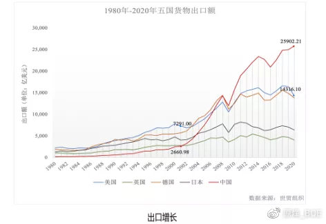 加入WTO是中國發(fā)展歷程的一個里程碑。我們用兩張圖,分別從出口規(guī)模和增長表現(xiàn)兩個方面來直觀理解中國加入世貿組織之后是如何從不斷擴大開放與全球合作治理中獲益的。