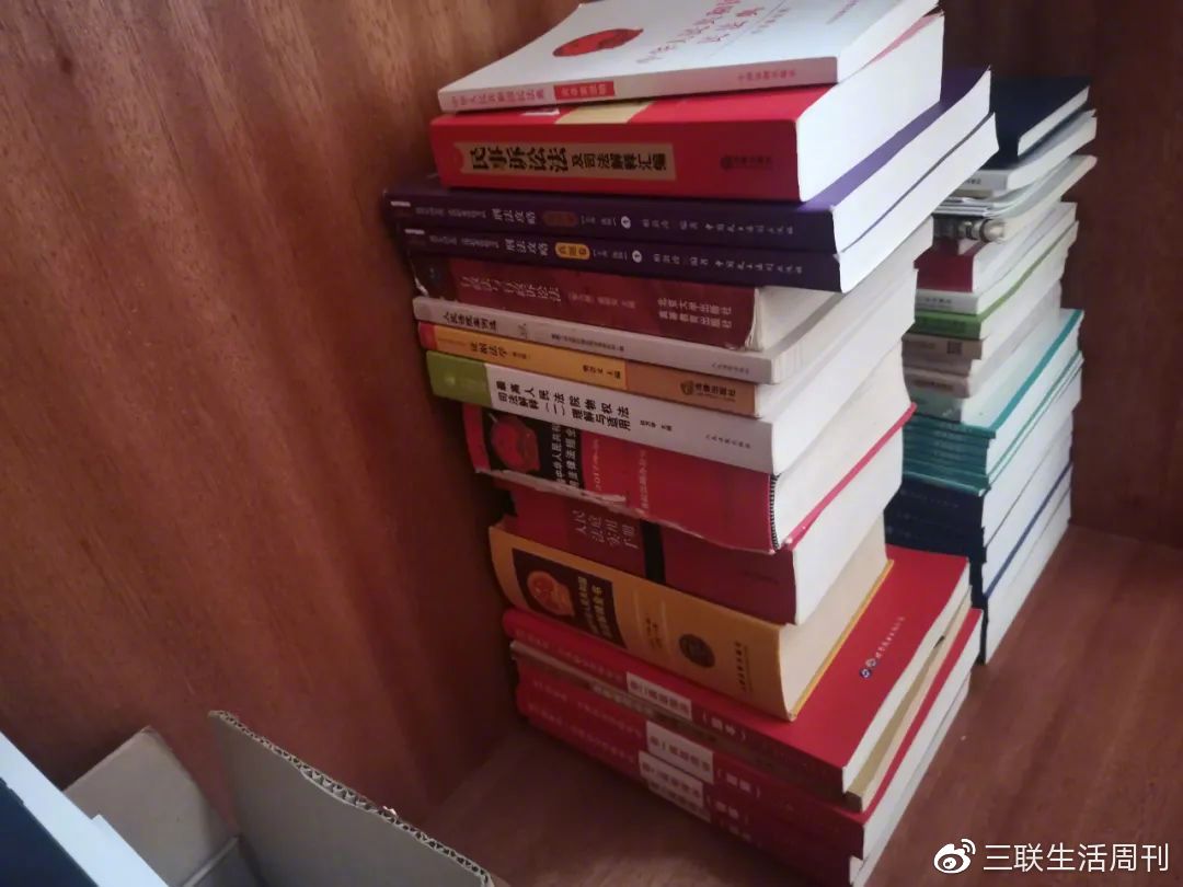 陳之強衣柜的書堆收集了大量法律相關(guān)書籍(吳淑斌 攝)