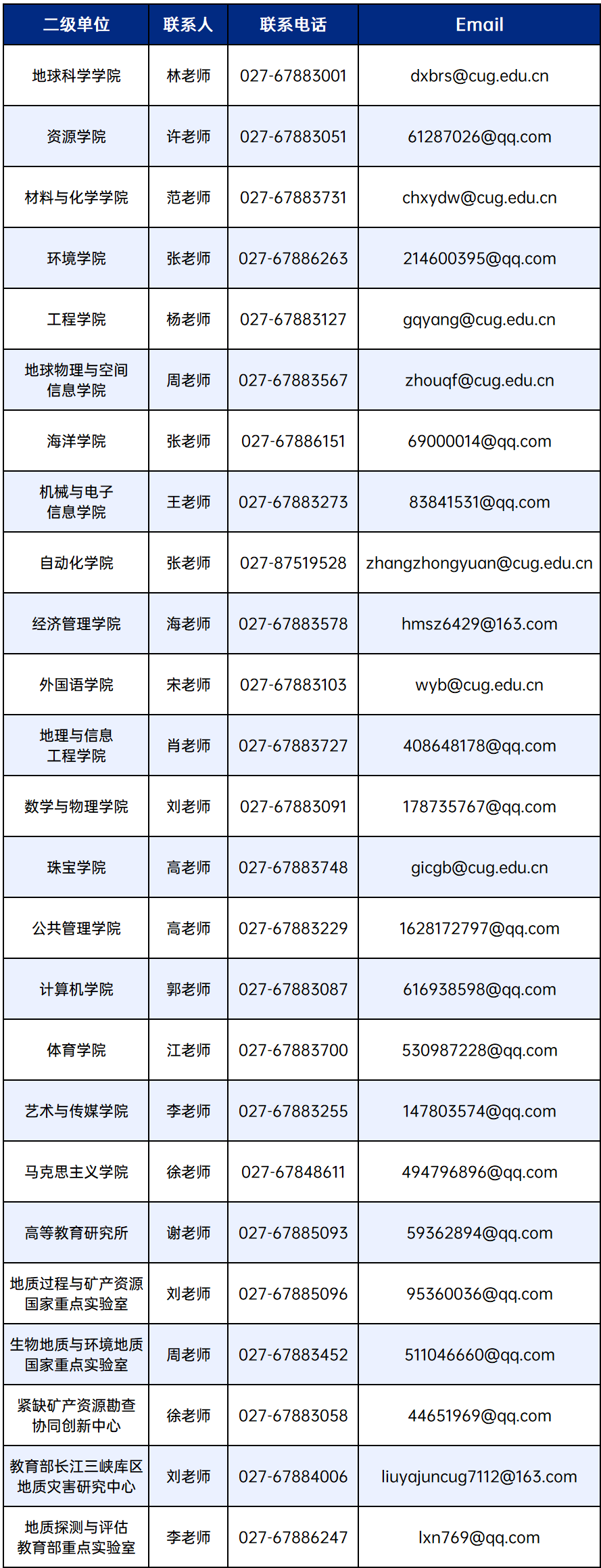 以上崗位分批次常年招聘,有意申報者,請盡快將簡歷發(fā)送至各二級教學科研單位,同時抄送至job@cug.edu.cn。郵件主題請注明擬應(yīng)聘崗位類別。