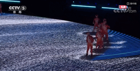 在升國旗、奏國歌儀式之后,一滴中國水墨暈染而開,黃河之水滾滾而來。“黃河之水天上來,奔流到海不復回”,翻騰的浪濤最終凝結為一片晶瑩剔透的冰雪天地,也好像是凝固了時光。
